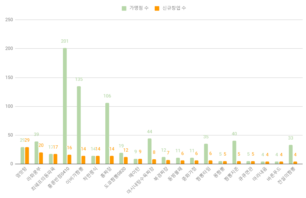 창업 순위는 프랜차이즈 브랜드 중 신규 창업을 많이 한 브랜드 기준으로 정리를 하였으며