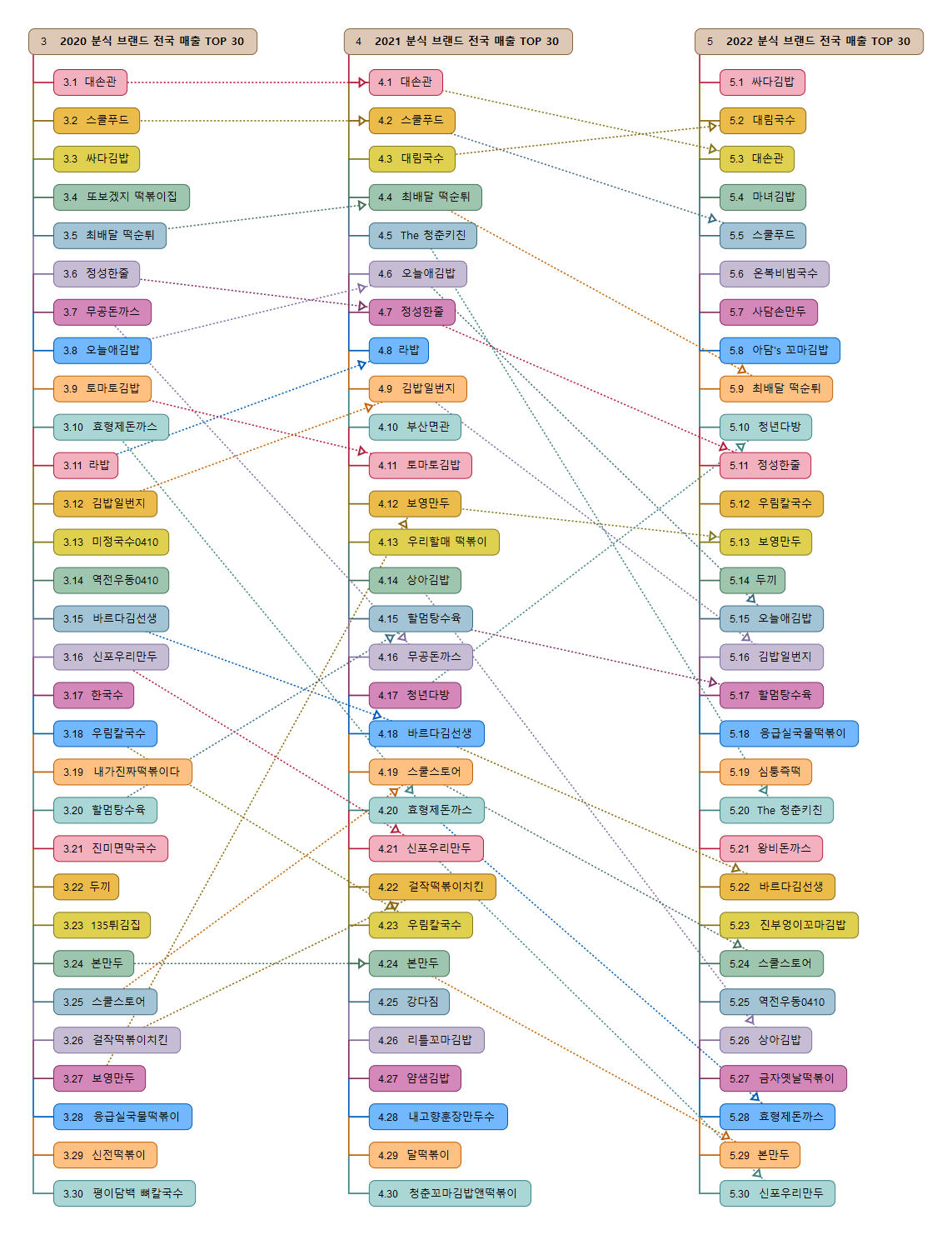 매출 상위 1위~60위 브랜드는 싸다김밥, 대림국수, 대손관, 마녀김밥, 스쿨푸드, 온복비빔국수, 사담손만두, 아담's 꼬마김밥, 최배달 떡순튀, 청년다방, 정성한줄, 우림칼국수, 보영만두, 두끼, 오늘애김밥, 김밥일번지, 할멈탕수육, 응급실국물떡볶이, 심퉁즉떡, The 청춘키친, 왕비돈까스, 바르다김선생, 진부엉이꼬마김밥, 스쿨스토어, 역전우동0410, 상아김밥, 금자옛날떡볶이, 효형제돈까스, 본만두, 신포우리만두, 토마토김밥, 한국수, 우리할매 떡볶이, 옆집떡볶이, 달떡볶이, 뚱보아저씨 수제돈가스, 김바라김밥, 무공돈까스, 바로그집, 아차산매운떡볶이, 얌샘김밥, 미정국수0410, 애플김밥, 부산면관, 면앤면추억의가락국수, 진미면막국수, 수유리우동집, 신세대꼬마김밥, 신전떡볶이, 장상궁(미니)김밥, 서리서리멸치국수, 오별난멸치국수, 국수나무, 알촌, 오정은A김밥, 청춘꼬마김밥앤떡볶이, 마미떡, 국물떡볶이 텬고, 레드신, 마뇨떡볶이 이다.