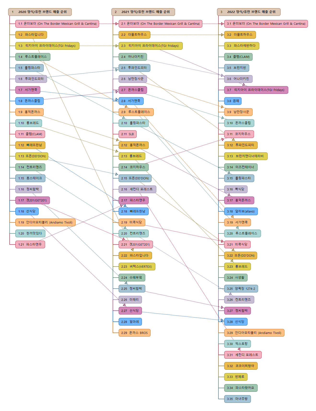매출 상위 브랜드는 온더보더 (On The Border Mexican Grill & Cantina), 더몰트하우스, 파스타에반하다, 클램(CLAM), 브런치빈, 어나더키친, 티지아이 프라이데이스(TGI Fridays), 꼼떼, 낭만장사꾼, 돈까스클럽, 코지하우스, 투파인드피터, 브런치앤디너테라비, 미즈컨테이너, 롤링파스타, 뽁식당, 홍익돈까스, 알라보(allavo), 서가앤쿡, 루스트플레이스, 미쿡식당, 뜨돈(DD'DON), 롱브레드, 사생활, 양목장 1274-2, 컨트리맨즈, 정씨함박,선식당, 안디아모티볼리 (Andiamo Tivoli), 믹스토랑, 세컨디 포레스트, 코코이찌방야, 빈체로, 파스타왔어요, 마녀주방이다.