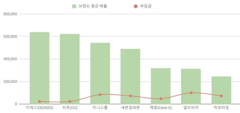 매출 상위 브랜드는 지에스25(GS25), 씨유(CU), 미니스톱, 세븐일레븐, 해빛(Have it), 알리바이, 하프타임 이다.