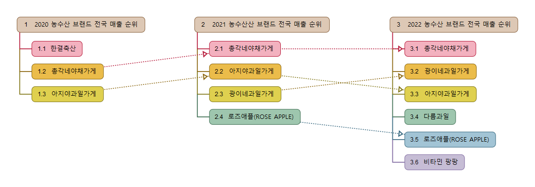 매출 상위 브랜드는 총각네야채가게, 광이네과일가게, 아지야과일가게, 다름과일, 로즈애플(ROSE APPLE), 비타민 팡팡 이다.