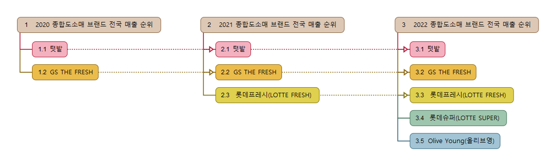 매출 상위 브랜드는 텃밭, GS THE FRESH, 롯데프레시(LOTTE FRESH), 롯데슈퍼(LOTTE SUPER), Olive Young(올리브영) 이다.