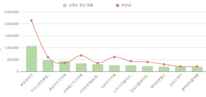 평균 매출 보다 높은 브랜드 순위로 정리했다. 기준 연도는 2022년이다.