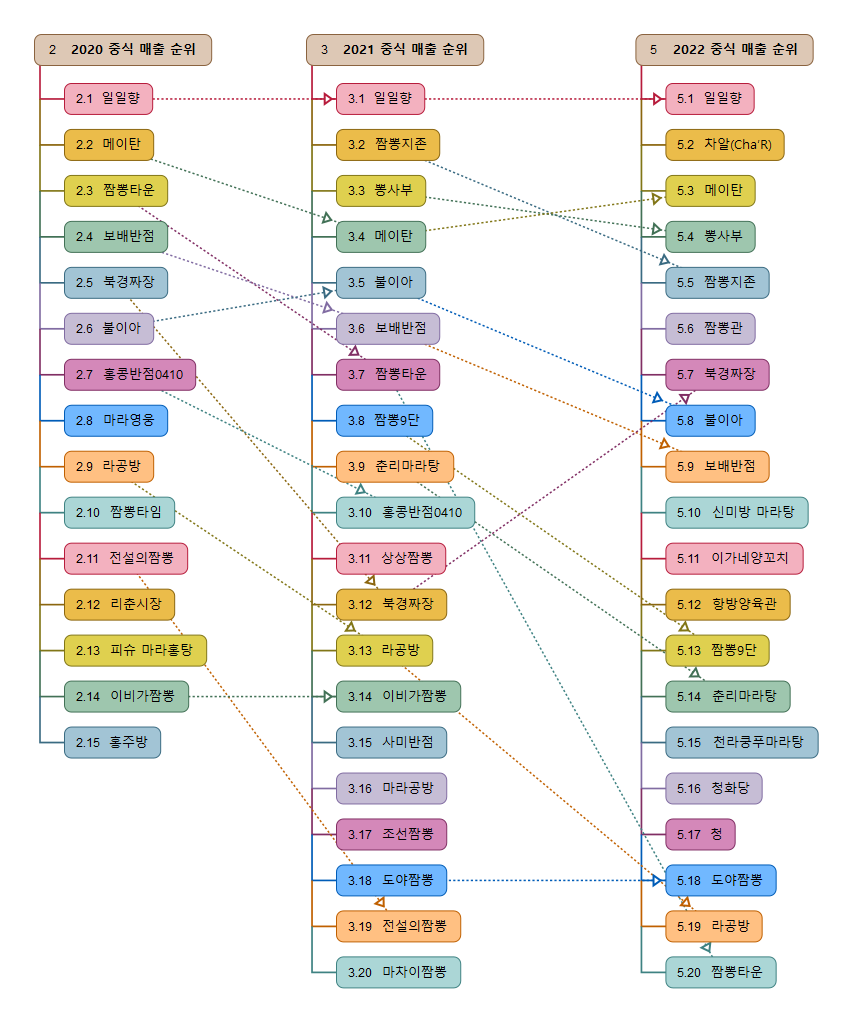 매출 상위 브랜드는 온더보더 (On The Border Mexican Grill & Cantina), 더몰트하우스, 파스타에반하다, 클램(CLAM), 브런치빈, 어나더키친, 티지아이 프라이데이스(TGI Fridays), 꼼떼, 낭만장사꾼, 돈까스클럽, 코지하우스, 투파인드피터, 브런치앤디너테라비, 미즈컨테이너, 롤링파스타, 뽁식당, 홍익돈까스, 알라보(allavo), 서가앤쿡, 루스트플레이스, 미쿡식당, 뜨돈(DD'DON), 롱브레드, 사생활, 양목장 1274-2, 컨트리맨즈, 정씨함박,선식당, 안디아모티볼리 (Andiamo Tivoli), 믹스토랑, 세컨디 포레스트, 코코이찌방야, 빈체로, 파스타왔어요, 마녀주방이다.