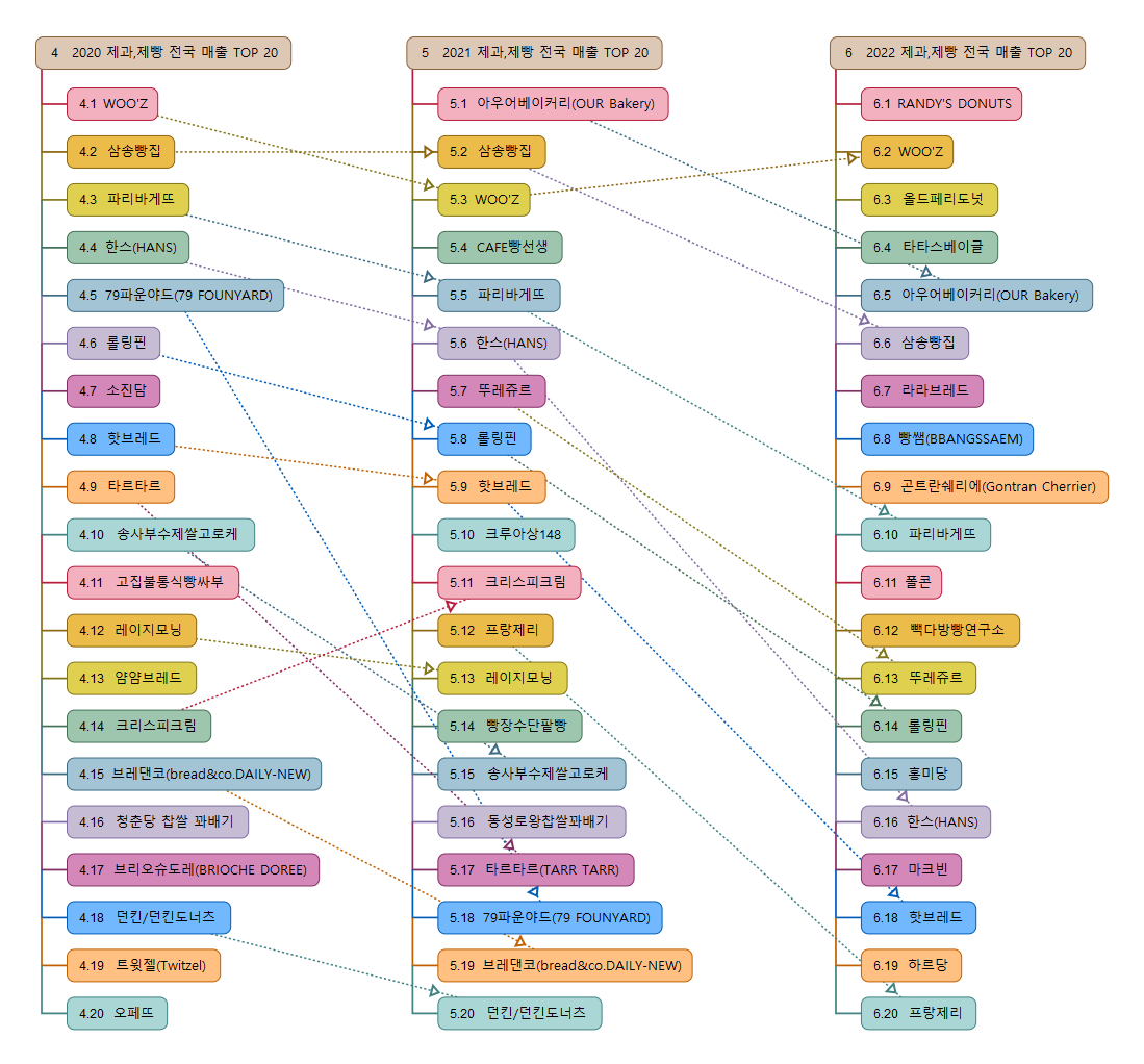 매출 상위 브랜드는 RANDY'S DONUTS, WOO'Z, 올드페리도넛, 타타스베이글, 아우어베이커리(OUR Bakery), 삼송빵집, 라라브레드, 빵쌤(BBANGSSAEM), 곤트란쉐리에(Gontran Cherrier), 파리바게뜨, 폴콘, 빽다방빵연구소, 뚜레쥬르, 롤링핀, 홍미당, 한스(HANS), 마크빈, 핫브레드, 하르당, 프랑제리, 버밀당베이커리, 크리스피크림, 레이지모닝, 복호두, 빵사부식빵공방, 던킨/던킨도너츠, 쟈빠따,브레댄코(bread&co.DAILY-NEW), WSTYLE DONUTS, 동성로왕찹쌀꽈배기, 동빵이다.