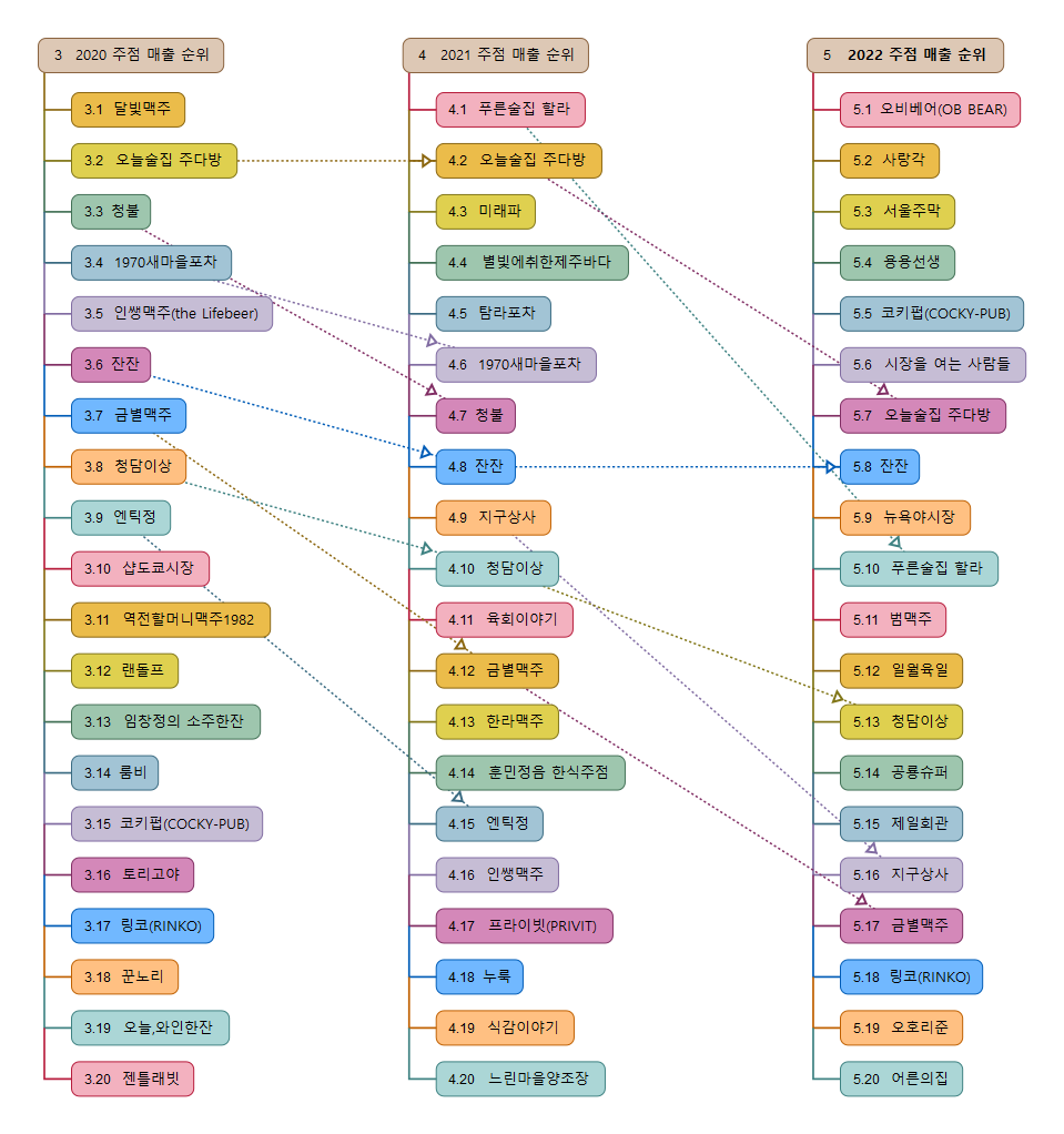 매출 상위 브랜드는 오비베어(OB BEAR), 사랑각, 서울주막, 용용선생, 코키펍(COCKY-PUB), 시장을 여는 사람들, 오늘술집 주다방, 잔잔, 뉴욕야시장, 푸른술집 할라, 범맥주, 일월육일, 청담이상, 공룡슈퍼, 제일회관, 지구상사, 금별맥주, 링코(RINKO), 오호리준, 어른의집, 준코노래타운, 별빛에취한제주바다, 토리고야, 심야식당 치치, 별빛맥주, 탐라포차, 이태리양조장, 하노이맥주밤거리, 서귀포로맨스, 인쌩맥주, 금복주류, 엔츠노래타운, 아트몬스터, 팔팔포장마차, 뉴코뮤직타운, 느린마을양조장, 전포여관, 온더문포차, 미래파, 프라이빗(PRIVIT), 대한식당, 낭만짚불구이, 오늘,맥주한잔, 한라맥주, 훈민정음 한식주점, 롱타임노씨, 임창정의 소주한잔, 월간맥주, 랜돌프, 식감이야기, 역전할머니맥주1982, 청춘사업, 짚동가리쌩주, 와인싸롱뱅뱅, 철길부산집, 단골손님, 회장님댁, 모로미, 청불, 김작가의이중생활, 사쿠라테이엔, 탄광맥주, 필스너하우스(PILSNER HOUSE), 와인주막차차, 육회이야기, 밀회관, 만만코코로, 아무술집, 크래프트한스(Craft Han's) 이다.