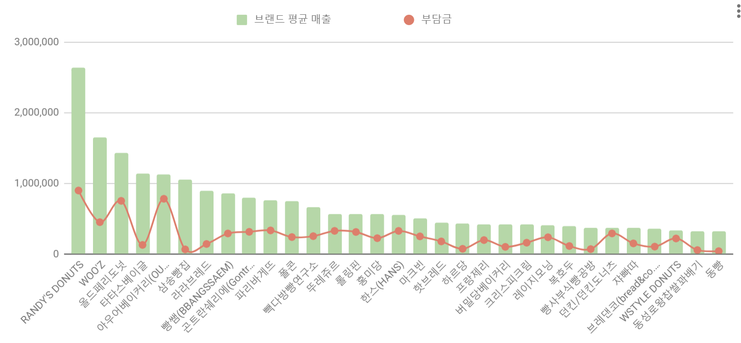 평균 매출 보다 높은 브랜드 순위로 정리했다. 기준 연도는 2022년이다.