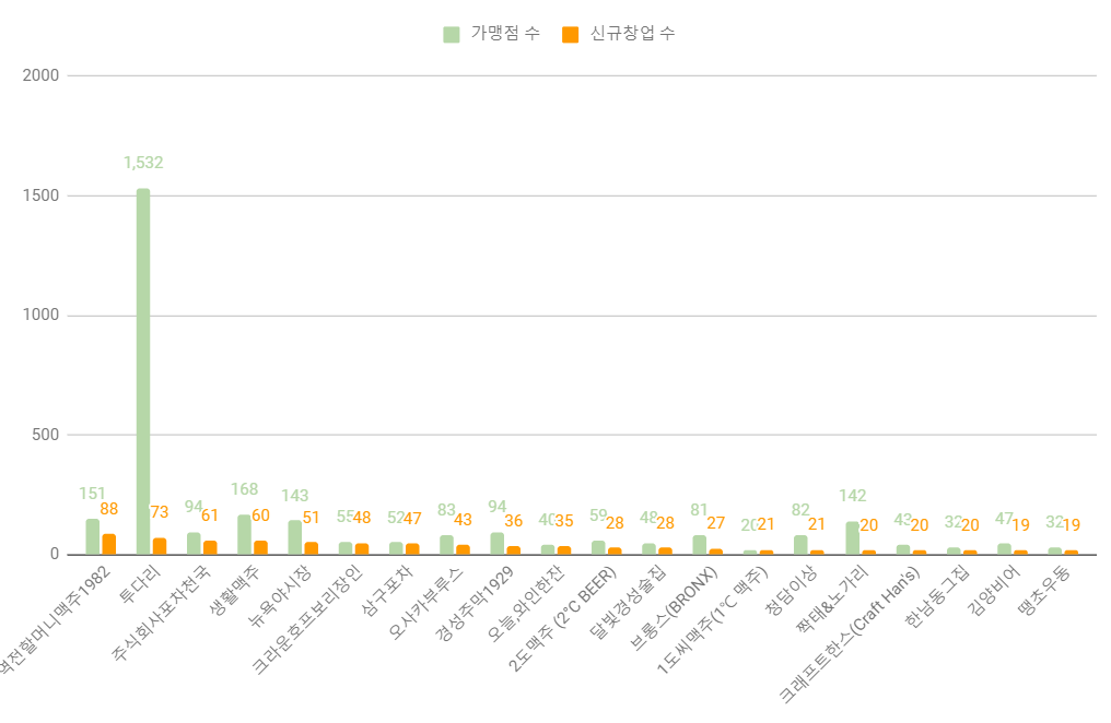 신규 창업 상위 브랜드는 역전할머니맥주1982, 투다리, 주식회사포차천국, 생활맥주, 뉴욕야시장, 크라운호프보리장인, 삼구포차, 오사카부루스, 경성주막1929, 오늘,와인한잔, 2도맥주 (2°C BEER), 달빛경성술집, 브롱스(BRONX), 1도씨맥주(1℃ 맥주), 청담이상, 짝태&노가리, 크래프트한스(Craft Han's), 한남동그집, 김양비어,땡초우동 입니다.